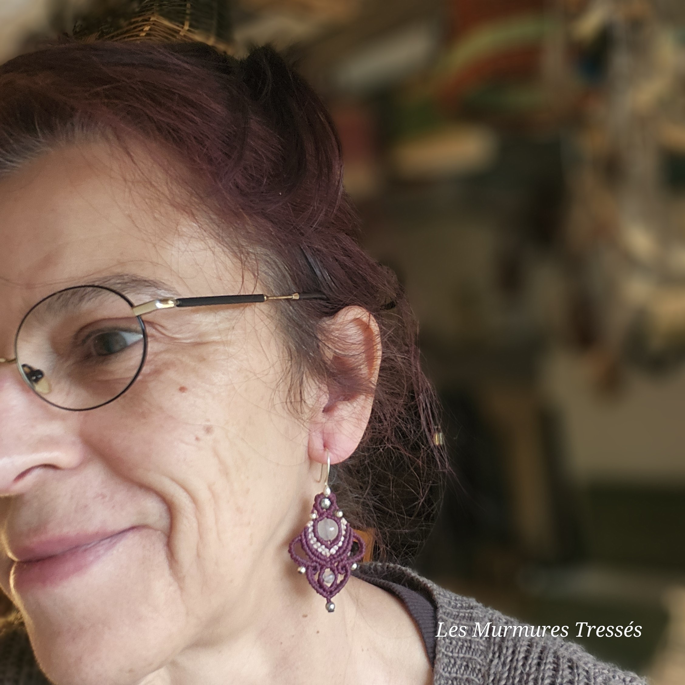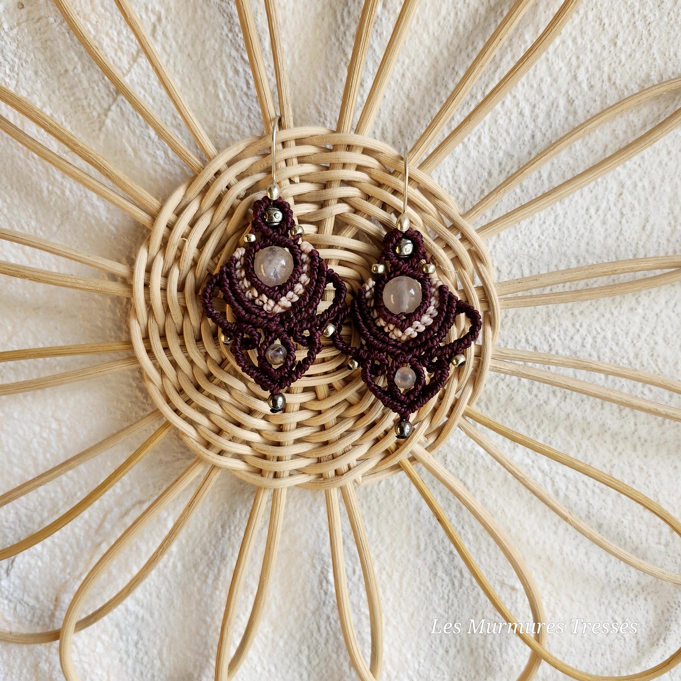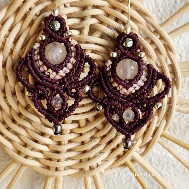 Tissées à la main en micro-macramé (fil Linhasita 1 mm) dans un joli dégradé de bordeaux et de rose pâle, elles s’ornent de perles de quartz rose, pierre du cœur et de la douceur, accompagnées de perles argentées qui reflètent la lumière avec élégance.