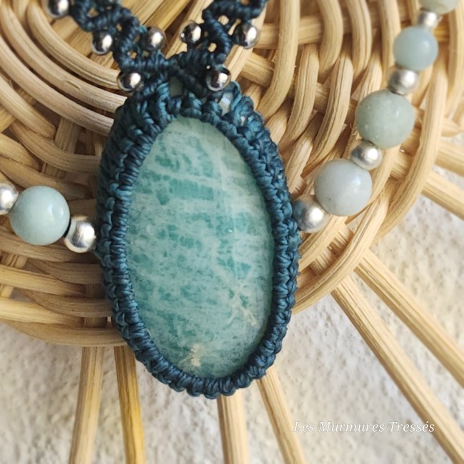 Entre les mains , le fil se fait ruisseau, les noeuds deviennent feuilles, et l' amazonite murmure sa douceur d'eau claire.