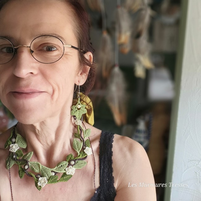 Une parure empreinte de douceur et d’harmonie, composée d’un collier et de boucles d’oreilles assorties, tissés à la main en micro-macramé.