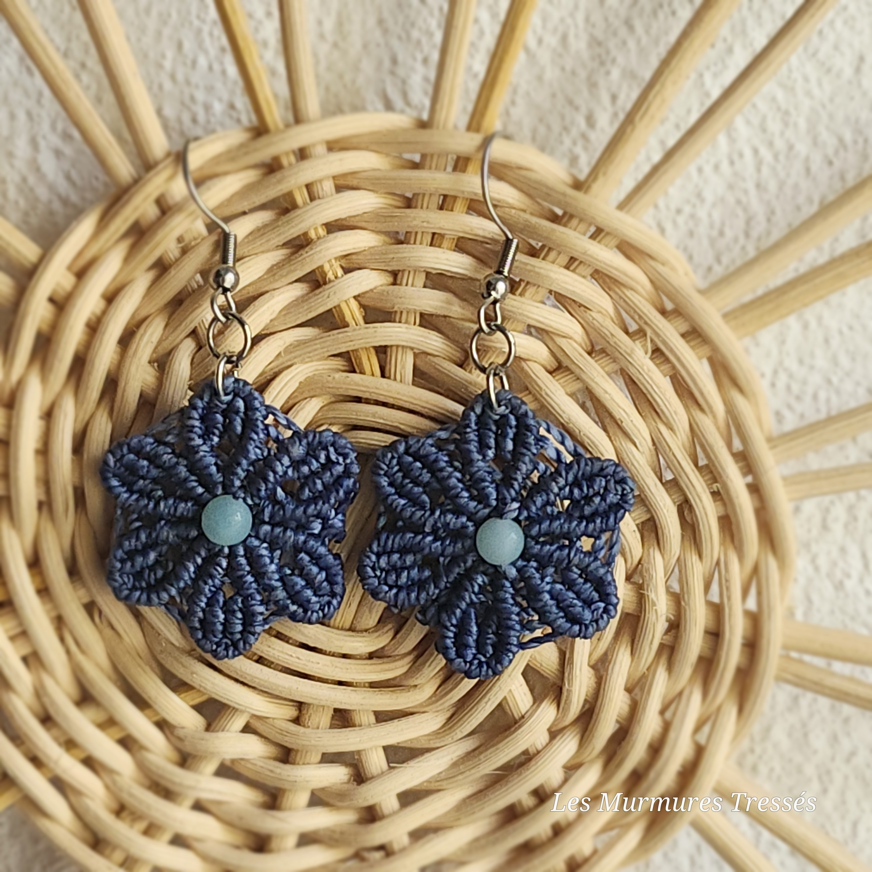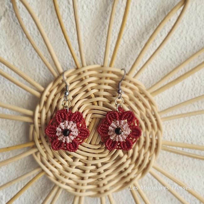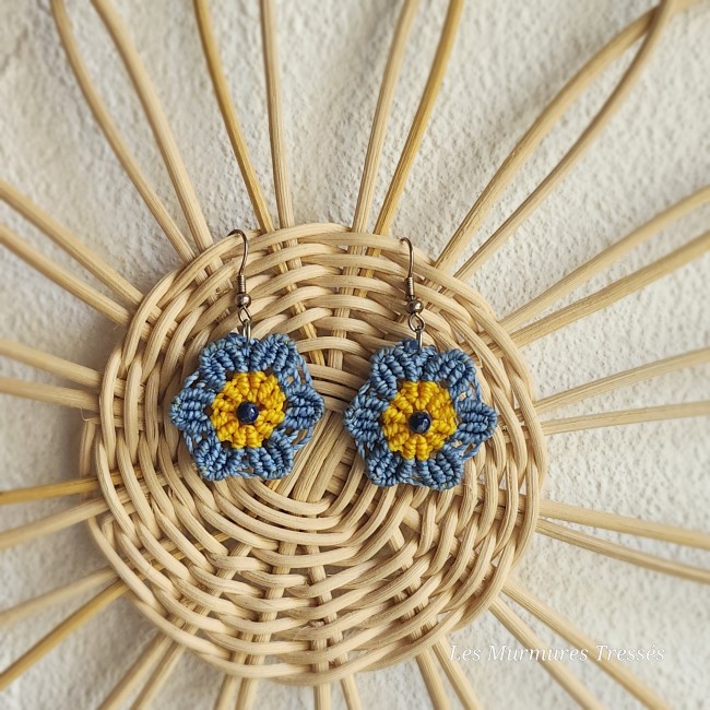 Les boucles d’oreilles “Fleur Tressée” sont entièrement réalisées à la main dans mon atelier, en micro-macramé fin (1 mm).