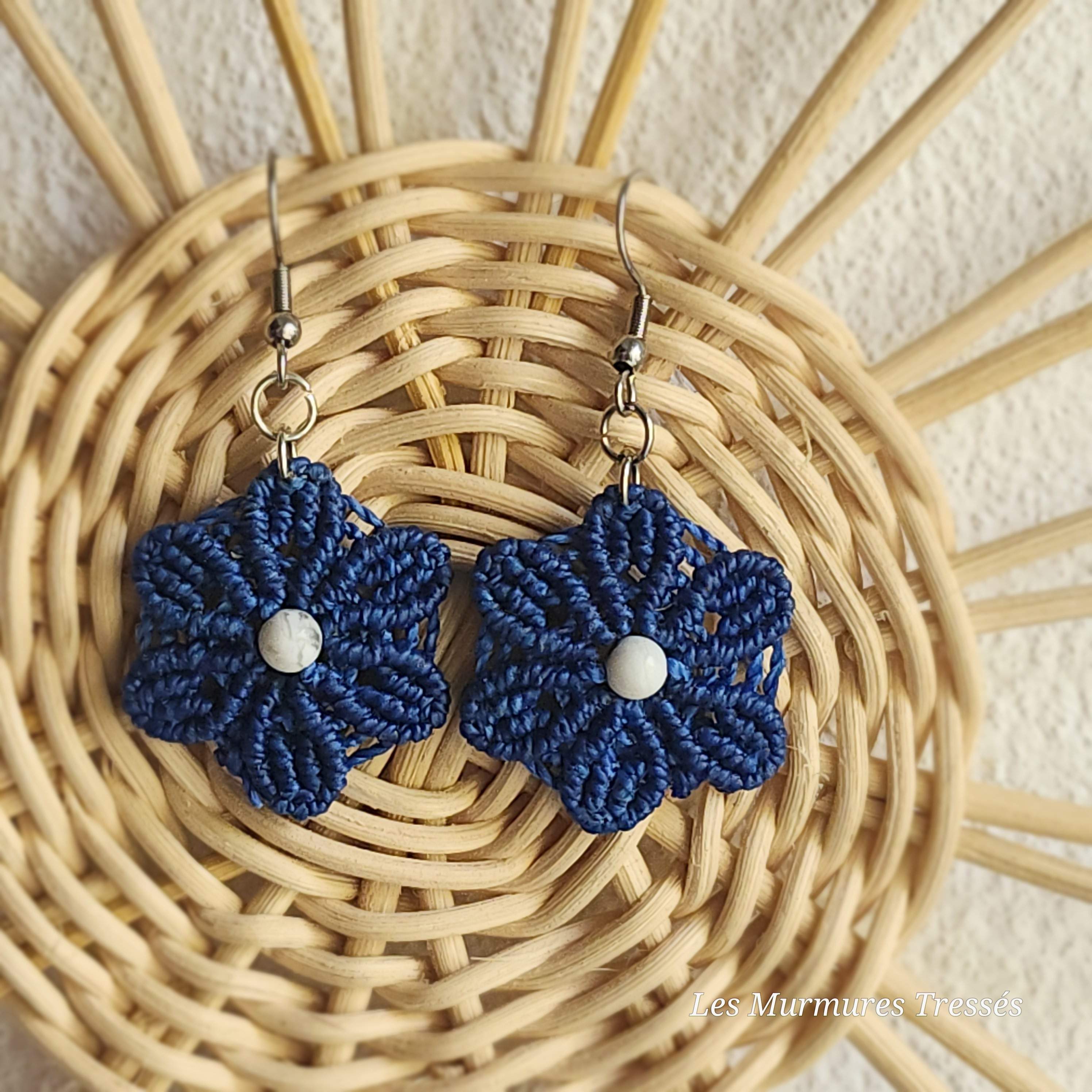 Les boucles d’oreilles “Fleur Tressée” sont entièrement réalisées à la main dans mon atelier, en micro-macramé fin (1 mm).