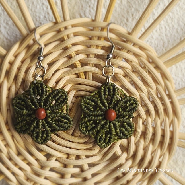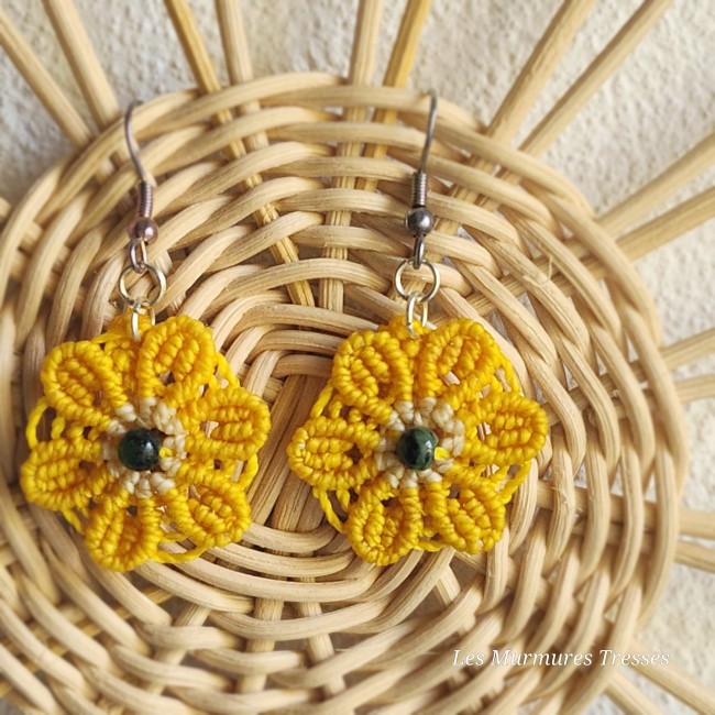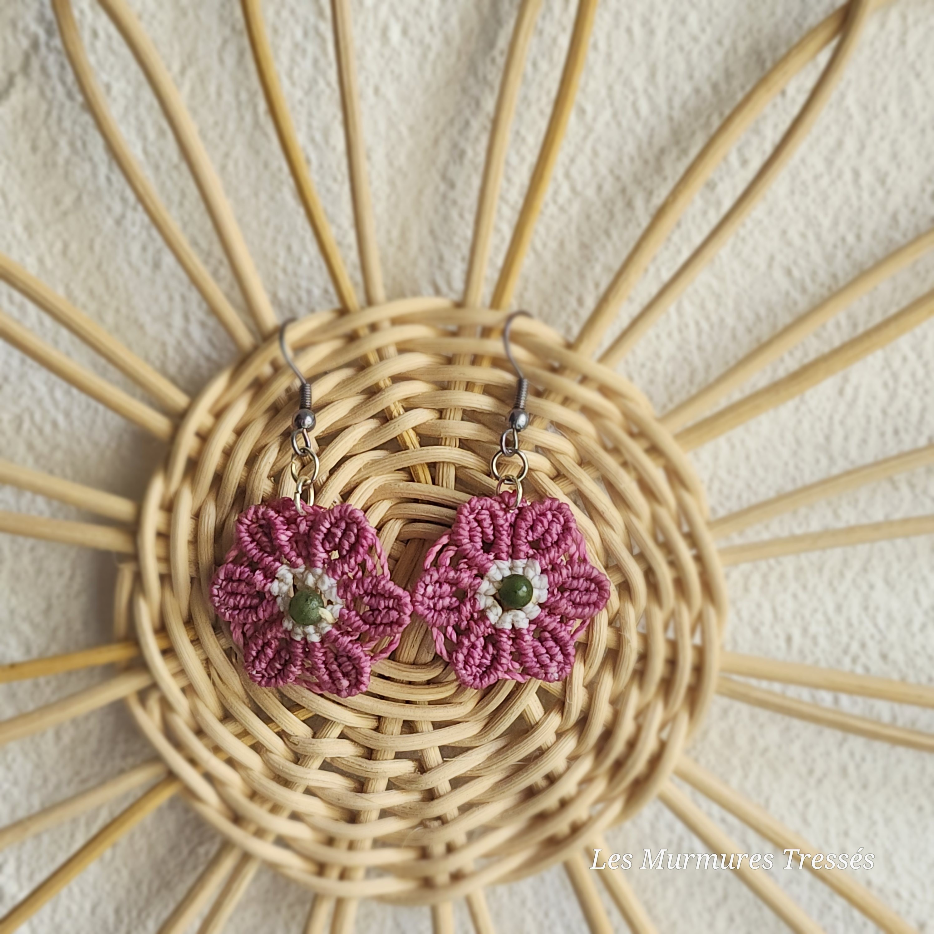 Les boucles d’oreilles “Fleur Tressée” sont entièrement réalisées à la main dans mon atelier, en micro-macramé fin (1 mm).