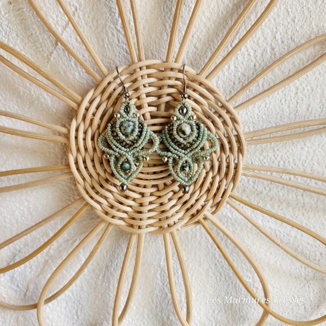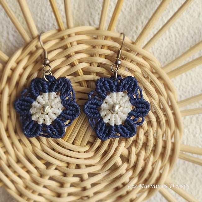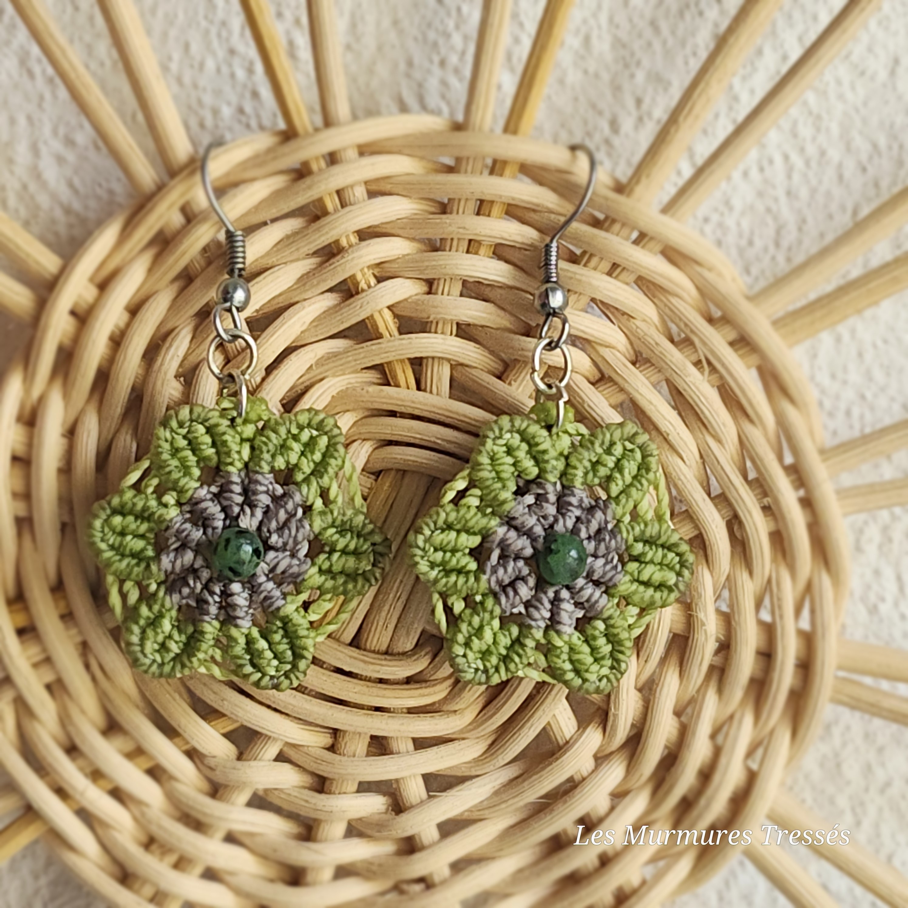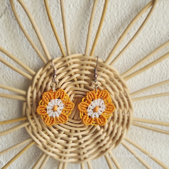 Les boucles d’oreilles “Fleur Tressée” sont entièrement réalisées à la main dans mon atelier, en micro-macramé fin (1 mm).