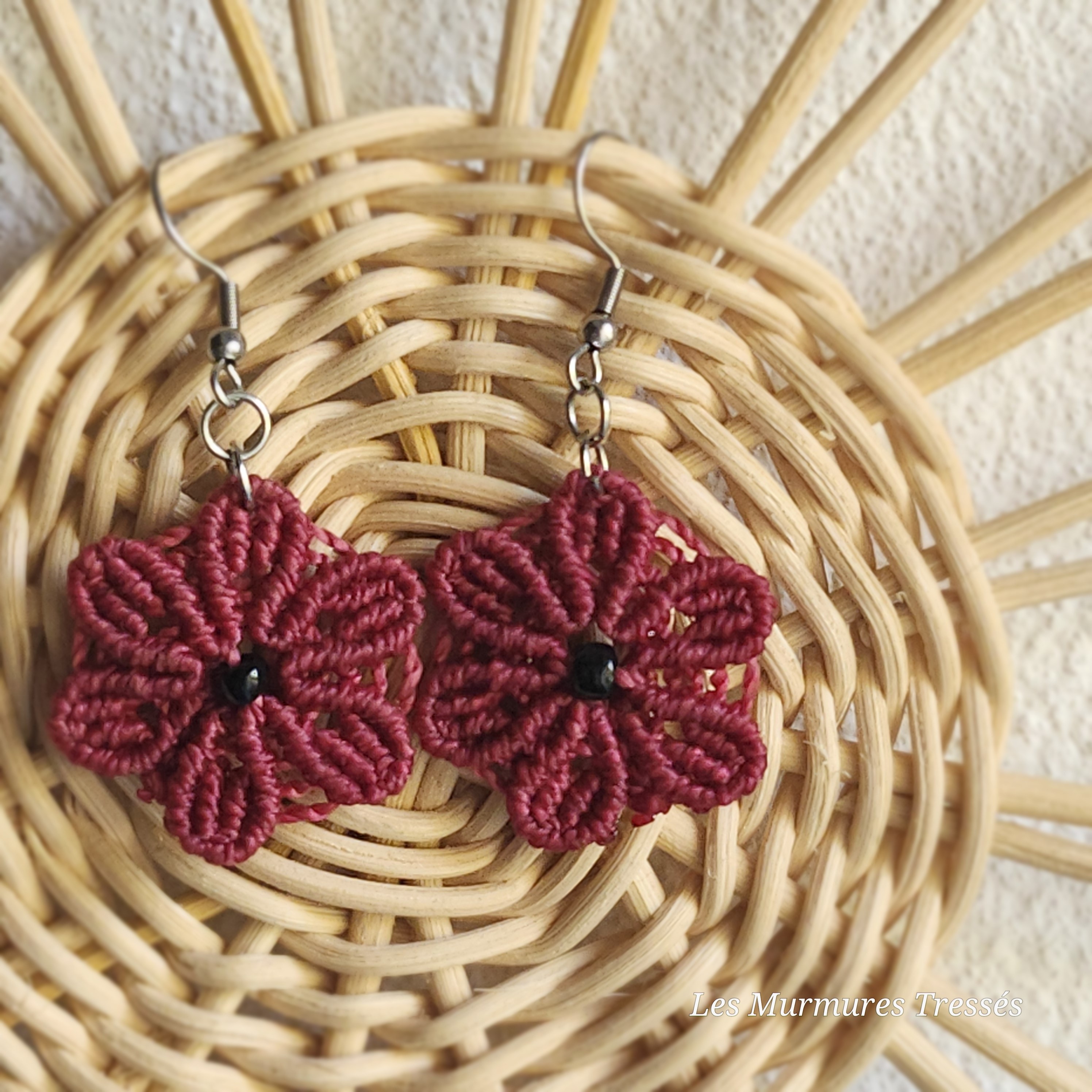 Les boucles d’oreilles “Fleur Tressée” sont entièrement réalisées à la main dans mon atelier, en micro-macramé fin (1 mm).