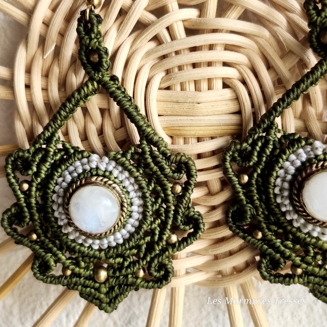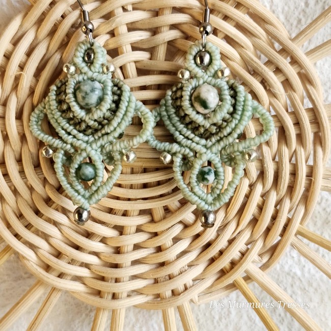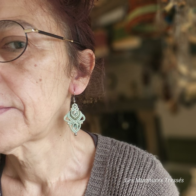 Les « Murmure de Sagesse » allient la douceur du vert tendre à la sobriété du gris, tissées à la main en micro-macramé (fil Linhasita 1 mm).