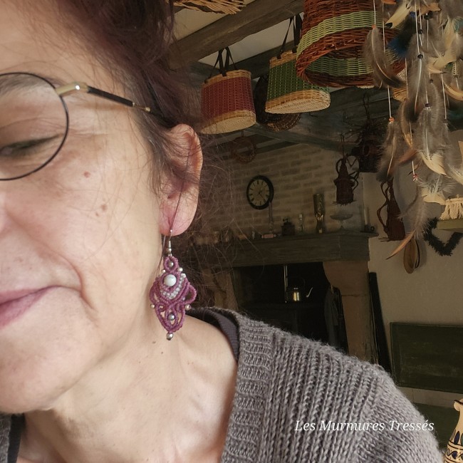 Les « Murmure de Douceur » associent la chaleur du fil framboise à la pureté du blanc, tissées à la main en micro-macramé (fil Linhasita 1 mm).