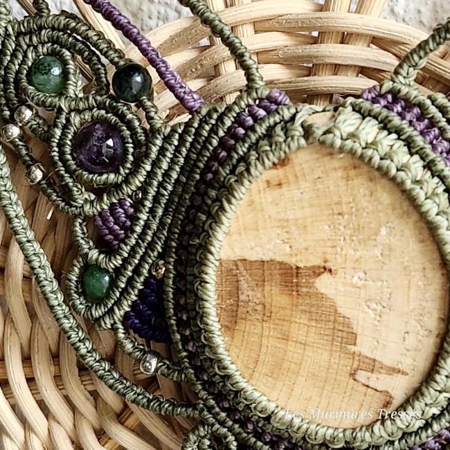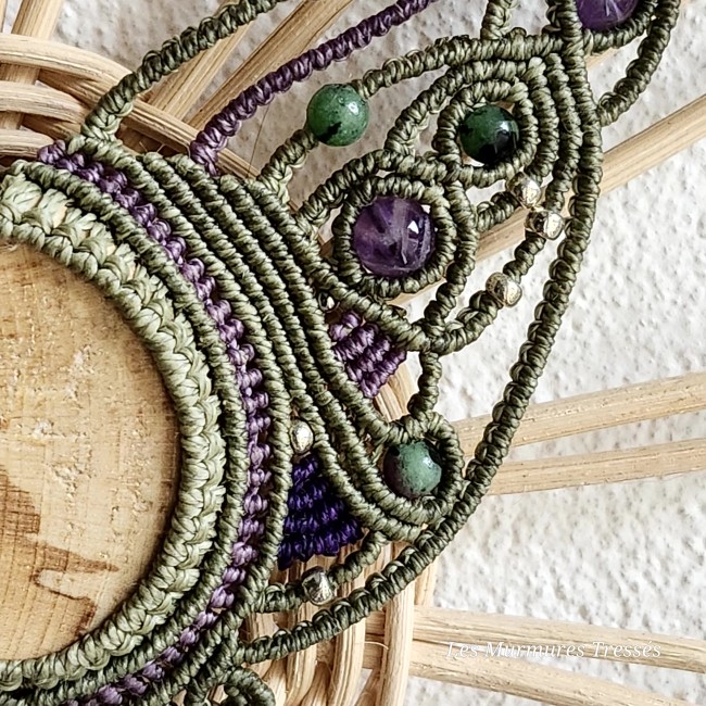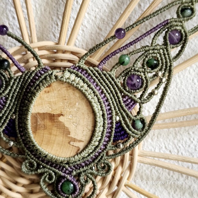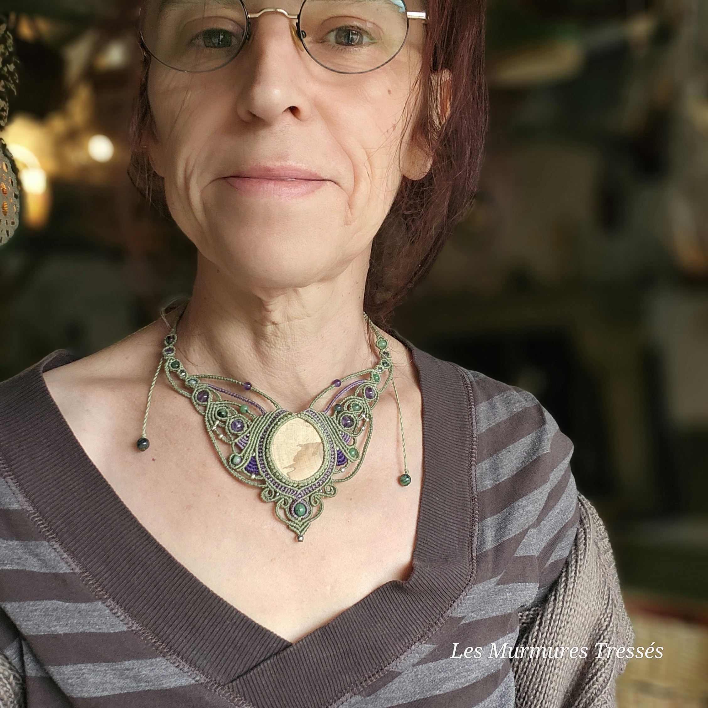 Le collier « Esprit des Bois » mêle la chaleur du bois des Ardennes à la douceur des fils vert tendre et violets. Entièrement tissé à la main en micro-macramé (0,75 mm), il évoque la connexion entre la terre et le souffle des arbres.