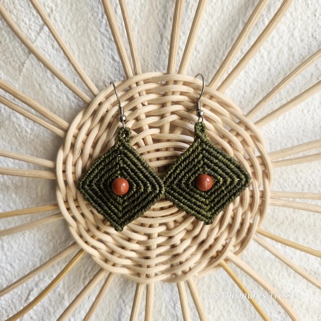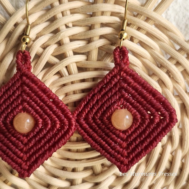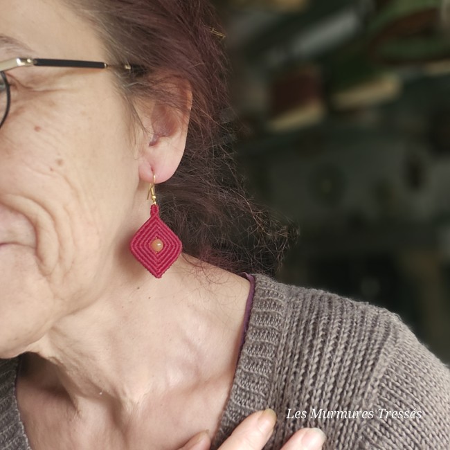 Boucles losange rouges, tissées à la main avec une perle de Cornaline au centre.Une touche ardente et élégante qui illumine votre style avec énergie et passion.